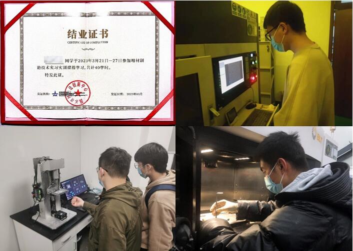 同学们在国家增材制造创新中心接受了系统的理论与软件培训,并针对激光熔融沉积成形、激光选区熔化成形、陶瓷打印、电弧熔丝等增材工艺进行了操作练习,实习结束时,增材院领导为同学们颁发了实习结业证书并合影留念;在西安交通大学机械制造系统国家重点实验室和创新港高端装备研究院先进制造研究所参观了高速高效加工、高性能精密测量、高精度装配、智能智慧高端装备等技术研究成果,以及微纳制造、生物制造等学科交叉特色研究工作;在西安智能再制造研究院参观学习了再制造工程研发成果转化及激光熔覆等核心装备,深入了解了再制造核心技术和工艺。