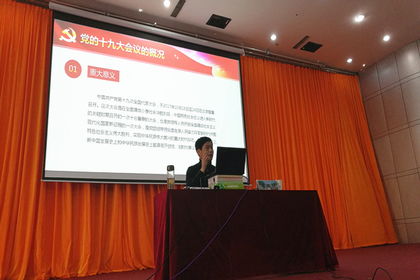 姚跃传以《以习近平新时代中国特色社会主义思想为指导,为实现中华民族的伟大复兴而不懈奋斗》为主题,从十九大开幕盛况讲起,向同学们阐述了习近平总书记作为领导人的突出贡献及人格魅力,彰显中国作为世界大国的国际地位,极其振奋人心。同时,他结合党的十九大精神,引出对新修订的《中国共产党章程》的学习和解读,并着重从五个切入点强调了要正确认识党性的几个基本问题。又引用十九大报告对社会主义核心价值观的最新阐释从国家、社会、个人三个层次向同学们详细讲解二十四字核心价值观的深刻内涵。