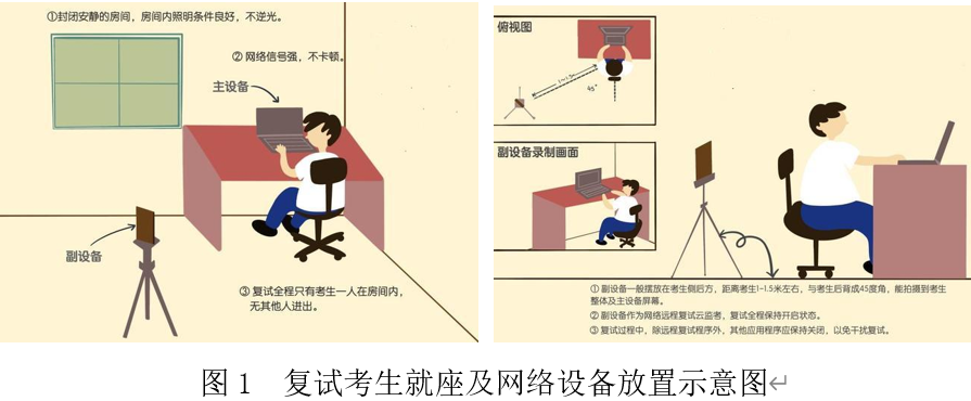 5.设备摆放要求:网络远程面试主设备,需要正向面对考生,复试全程开启,摄像头正对考生。复试过程中,要求视频中考生双手和头部全程在视频录像范围。网络远程面试监考及备用设备,摆放在考生侧后方(与考生后背面成45°角),能够全程拍摄考生本人和电脑屏幕,复试全程开启。复试考生就座和设备安放位置参考图1。