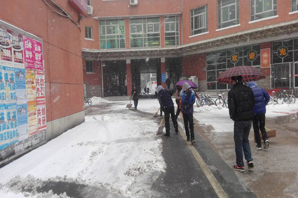 铲雪除冰过程中,同学们手持铁锹、扫帚、竹竿等清扫工具,一起挥洒汗水,奉献力量,分工明确,默契配合,对校园主干道、学校宿舍区以及食堂周边地区的积雪进行清扫,铲子与地面的敲击声奏出最美的劳动交响乐。虽然室外寒气袭人,却丝毫挡不住教职员工和同学们铲雪除冰的干劲,师生们的头上落满了雪花,手和脸都冻得通红,也没有影响大家的热情和工作效率,鞋子里、衣领里不时有雨雪侵扰,可他们一直微笑着,互相之间还暗中进行除雪比赛,越干越有劲。
