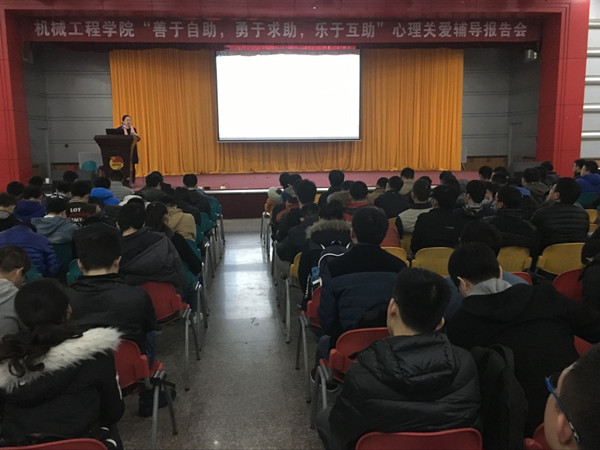 为了营造关爱自身,关心他人,共筑和谐校园的良好氛围,12月16日下午,机械工程学院在屯溪路校区东风报告厅举办主题为“善于自助,勇于求助,乐于互助”的大学生心理关爱辅导报告会。报告由学工部心理健康教育与咨询中心李艳老师主讲,学院辅导员、各班班长、寝室长及党支部书记300余人聆听了此次报告会。